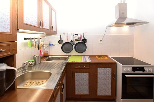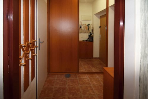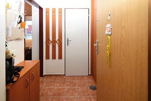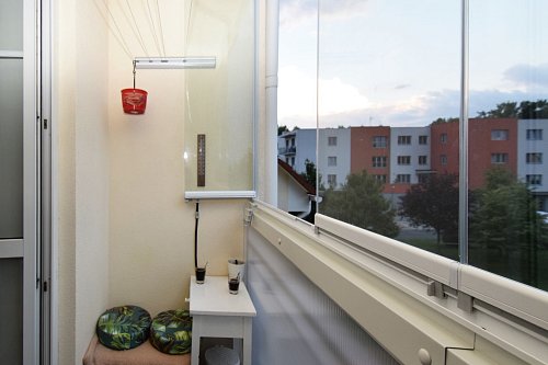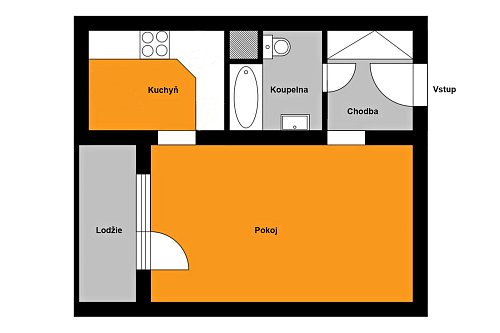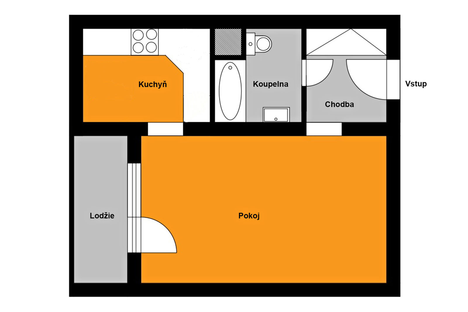 Dispozice bytu: vstupní chodba s vestavěnou skříní 3,24 m2, rovně se vchází do koupelny s WC 3,70 m2, nalevo se nalézá obývací pokoj 18,15 m2 se zasklenou lodžií 3,85 m2, na který navazuje kuchyň 6,05 m2.