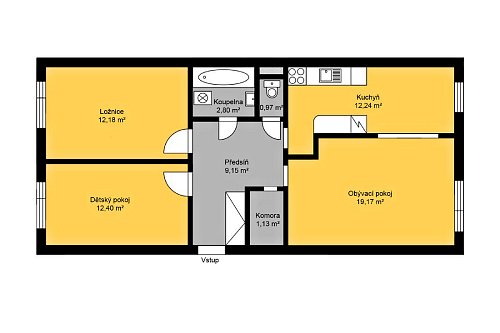 Dispozice bytu: vcházíte do chodby 9,15 m2, se šatnou 1,13 m2 a vestavěnou skříní, nalevo se nalézá dětský pokoj 12,40 m2, dále ložnice 12,18 m2, rovně vejdete do koupelny s vanou 2,80 m2, dále WC 0,97, napravo se vejde do kuchyně 12,24 m2 a poslední dveře jsou do obývacího pokoje 19,17 m2, který je propojen s kuchyní .