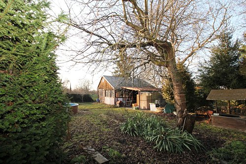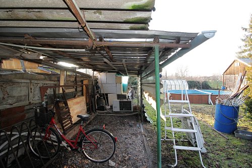 Na oplocené zahradě se nachází obytný vagón, který je napojen na el. energii, dále polozapuštěný bazén, zahradní přístřešek na dřevo a suché WC.